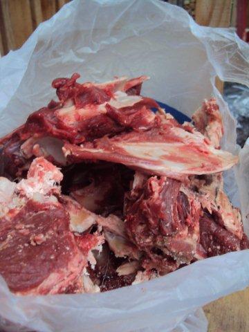 Not so the local slaughter. Of course, the local hunter hangs and bleeds his dead ruminant and all that but the pieces that are hacked off willy nilly (so to speak) are not wiped 100% clean and wrapped in plastic with a styrofoam tray as background. Get a deer roast from a local and you get a brown bag with a bloody lump in it. Feels pretty primal. And it is.