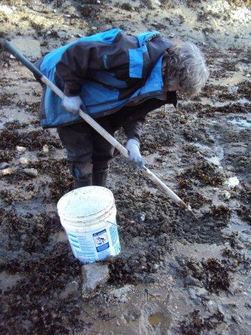 We went down with two five gallon buckets and a clam rake.  Two dogs carrying a toy each optimistically joined us.  Usually the lagoon means ‘play and swim and fetch’ time for them but today they were ignored.  Well, as much as two dogs with throw-toys can be ignored.  I dug.  Sally picked.  And we threw the odd thing for them.  And within a half hour we had enough clams to make a very hearty and voluminous batch of clam chowder.  It would be enough for three meals.