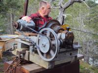 John came over and marveled at it. He helped figure it out and ‘made it go’. “Geez, the old geezer (it just has to be an old geezer) was some kind of genius, eh? I mean, look at that junk! He used a pulley off an old washing machine, made handles out of old pipes, lined it all up on a home-made wooden, adjustable frame and it works as good today as it did when he cobbled it together at least 60 years ago.” (it has to be that old at least, maybe older).