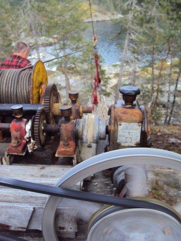 This old, home-made ‘contraption’ works like a hot dam! Yes, it is a bit slow at only 6 feet per minute (meaning: it takes 20 minutes to haul a log up the hill vs the 6 or seven minutes the old winch took) but this one is electric, it is quiet and it is a lot stronger. Wa-bloody-hoo!