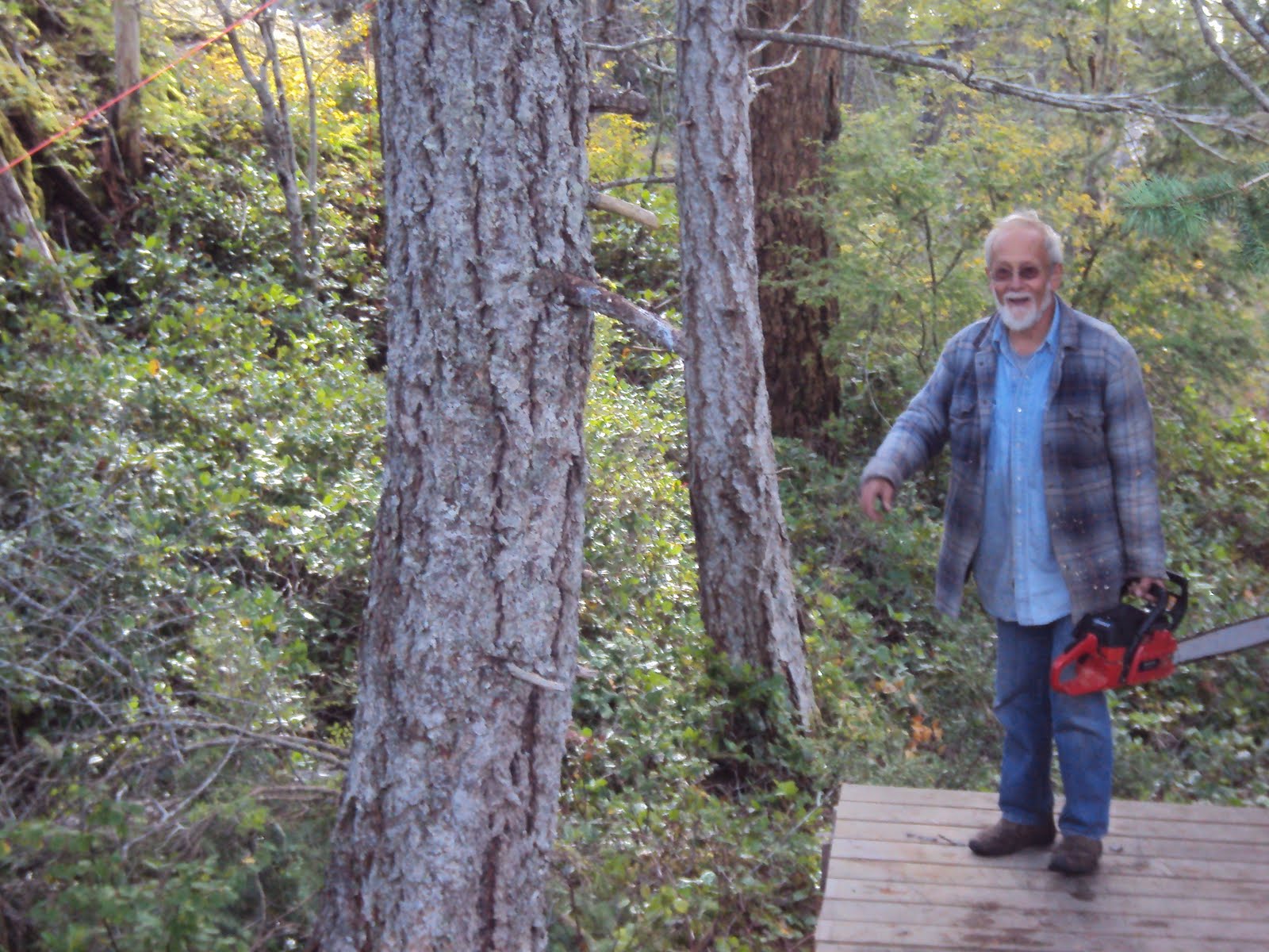 Yesterday, ‘old coot’ comes by while I was napping and, before I can get up, climbs the tree beside the dead one and drags a bit of equipment with him. I show up to see him thirty feet up a tree tangled in ropes.