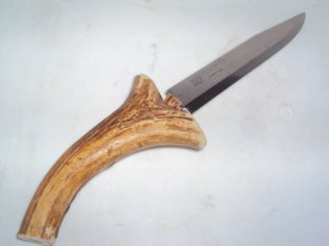 But one was re-handled with deer horn. The other with a blank from ‘old growth’ Fir. I putzed about all day making sure the tangs stayed in the handles and that the whole thing – when set up – felt ‘good’ enough to use. Can’t honestly say I did a great job. The deer horn knife is a bit weird.