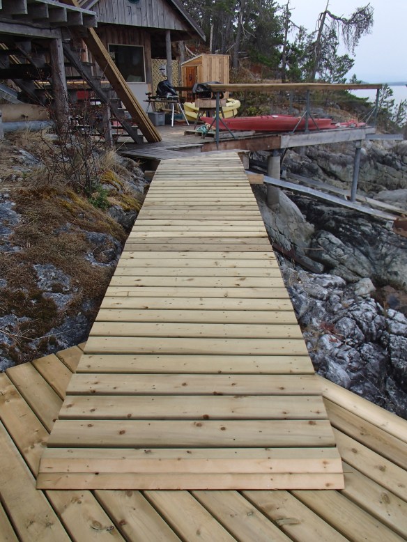 So, let’s just start with a simple update: Lower deck and adjoining bridge complete (it joins the two lower decks). And new guest bathroom up and almost functional. Still gotta plumb gas and water. But at least the structure is up. The newish deck it’s on works well, too. It looks nice. So far, it is all going according to plan – if we actually HAD a plan, that is.