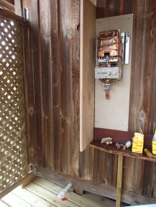 “Hey, Sal. I was just thinking that we had this rough idea about the bathroom, changed it a dozen times on the fly and yet, not once did we figure out where the demand hot water heater was to go. Now that it is built, where should I put it?”