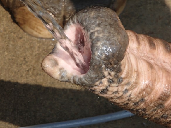 But, by far, the best part was simply hanging out with the elephants. There were six of them. One male, five females. And, in keeping with the times, our guide showed some disdain for the male. Seems males go into ‘rut’ or ‘season’ and glands open on their necks and ooze some kind of musk. She found that disgusting. She then went on to say that, when the males were in this condition, the staff simply put them out in the field as much as possible so as to let them ‘work that out’