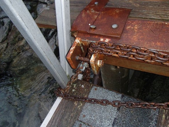 John (and by extension us) wouldn’t be without a tirfor. Just used it to drag our barge and tinboat on shore to change the leg oil. You have a nice ramp, ours is all hand made out of logs and boards, but it is John strong. The shore end is chained to logs that have been bolted into the granite cliff. The other end on the float glides (if necessary) on logs covered in metal. To keep the ramp in place on the float end there is a large vertical bolt John calls the Jesus pin. It would take massive lake waves to jump the ramp over it. Hasn’t happened yet and most likely won’t, but you never know. Question, what is the floating structure on the dock? A shed or someone’s small cabin? – Margy