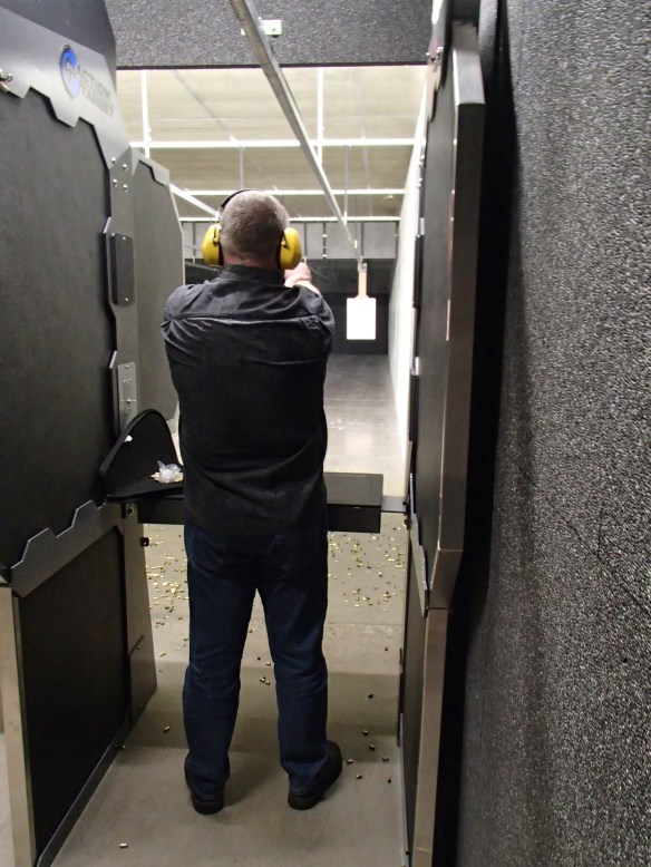 As I worked my way through my 50 rounds, I sent the target further and further down the lane until my last barrage was focused on a smaller target about 60 feet away. It was about 12″ x 16″. I hit it nine times. I shot rapidly, a la Arnie or Bruce. It was not from the hip but it was not aimed either – just pointed. I was encouraged by the results.