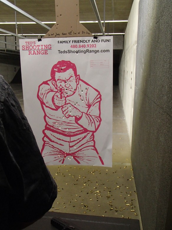 Guns are a big deal in Arizona. Everybody, it seems has one or forty three of them. This is NRA country. So, Sal and I went to the local gun range yesterday to ‘go local’.