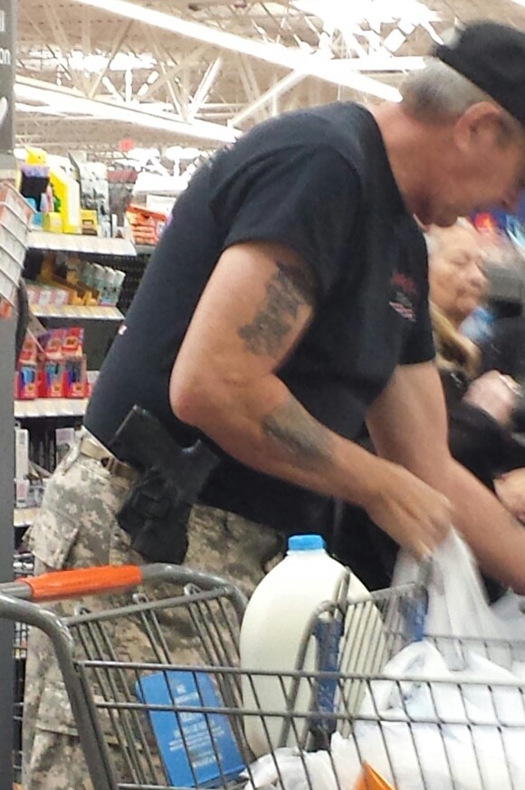 So, we found something else and headed out. Sal went through the checkout and I sat and watched ‘the people of Walmart’. In the line-up beside Sal’s was a quite tall, older guy getting groceries with his immensely proportioned, dyed blond wife. He was wearing camo pants and a T-shirt which revealed a lot of arm tattoos. I looked at him. He looked weathered. He was fit. He looked like a desert dweller. And, he was wearing a black holster on his belt with a pistol in it. Open carry. Gilbert, Arizona. Walmart.