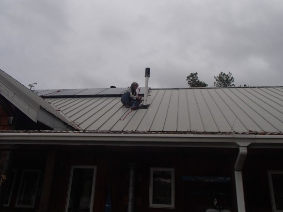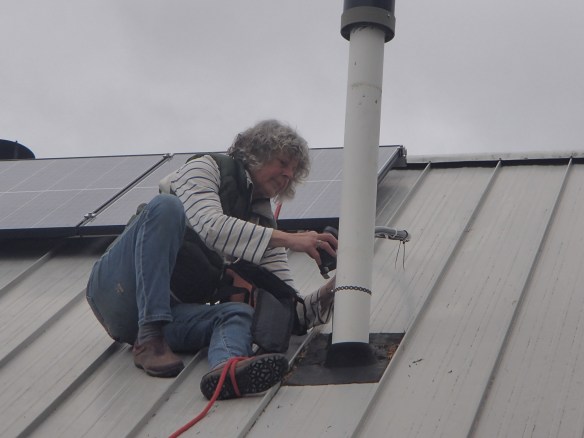 The chore was not overly difficult.  We had to waterproof the roof-side connection where the wire ran down to the ‘power’ closet.  That required some fittings, some rubber sheeting and some hose clamps.  Basically an hour or so.  The HARD part is that the roof is metal, obviously on a slant (about 30 degrees) and slippery.  Sal was in a harness and roped off.  She was safe.