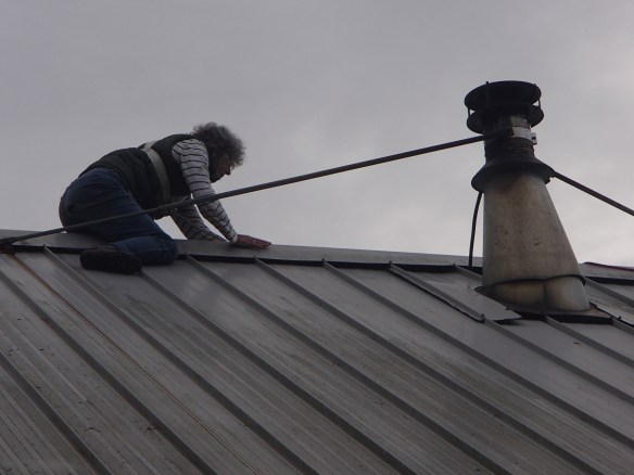 Is it the work?  No.  Not really.  Mike worked.  A lot!  And I ran around quite a bit yesterday steppin’ and fetchin’ for the roof-crew so physicality was involved but today, it was not so much ‘work’…but still…fatigue…why?   Primarily because, when Sal is up a roof or on a tower or hanging from a tree (just a matter of time) I am nervous for her.  Makes no difference if she is strapped and wrapped in all the safety gear, I am tense.  I am like a squirrel on amphetamines, twitching.  Looking everywhere.  Nerves a’janglin’.  And Sal feels much the same way although she thinks it’s worse for the one watching.