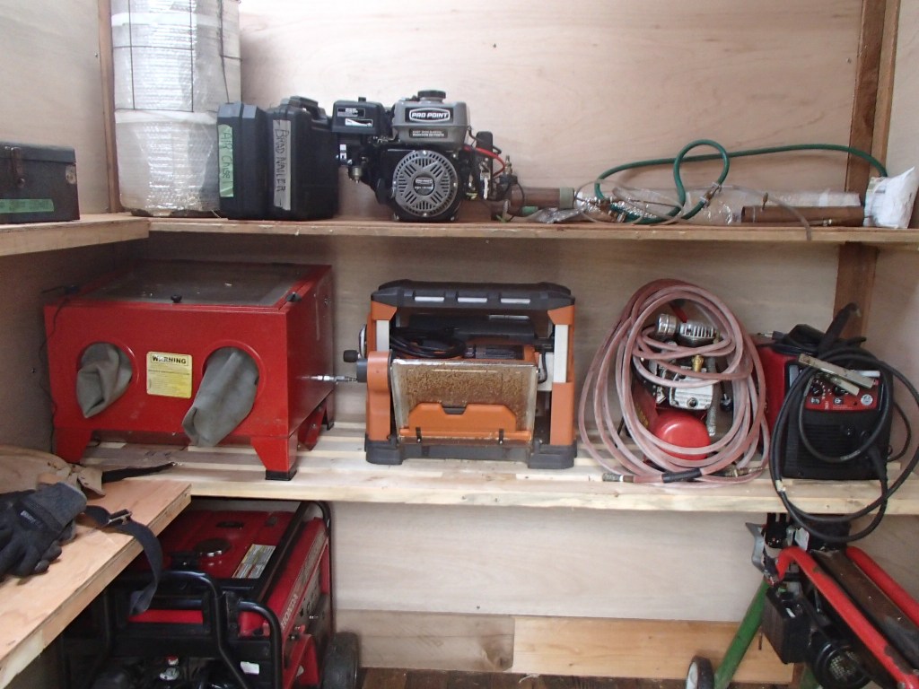 Every day I add another few hooks, a shelf, clean up some tools, lube a few things, organize some more, put stuff away…you know…the usual…..but, at the rate I am putzing and fiddling, I have a good week ahead of me before I am done. Just sharpening saw blades takes forever. Some things surprise me, tho….like I have 3 containers of chainsaw bar oil, I have two and have containers of jack oil (for jacks) and more cans of weird stuff than I ever realized. And oh, man, do I have glues and adhesives!