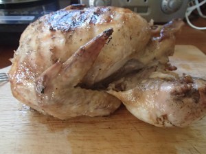 Miracle? Yes. But it was a less than aesthetic one. The chicken was clearly cooked but not all that brown. Not Costco brown, anyway. More like a tan. Hmmm……so I fired up the grill and gave it a minute on high flames and voila! It was brown and crispy.