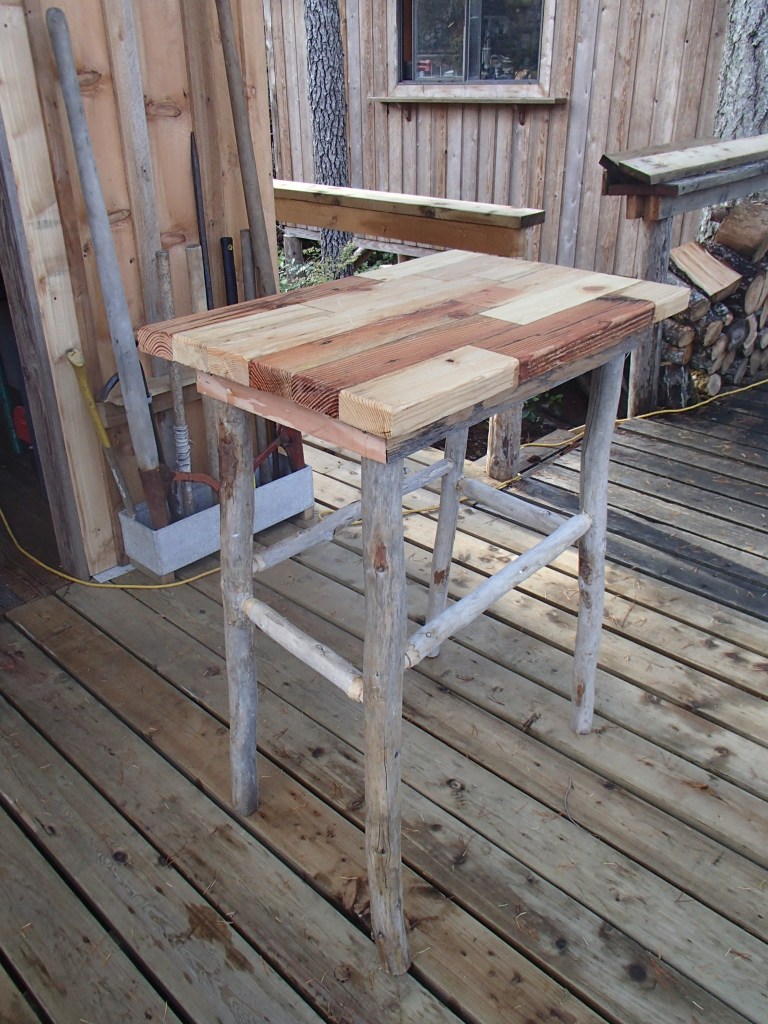I cobbled up a table from that ‘patchwork quilt’ of wood bits yesterday. It looks good. I am no fine-carpenter but it would look ‘at home’ in any remote Siberian village or, perhaps, some inbred, poor section of Appalachia. My aesthetics are crude, my skills are lacking and my standards are a smidge low, I have to admit to all that.